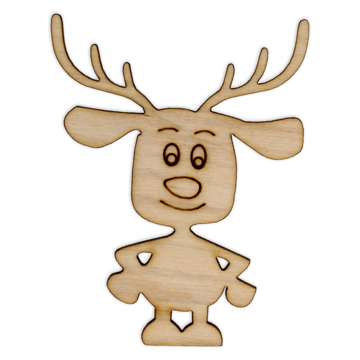 Uśmiechnięty renifer podbiera się raciczkami o swoje boki. Poza charakterystycznymi porożami, Rudolf posiada uszy, które wesoło odstają.