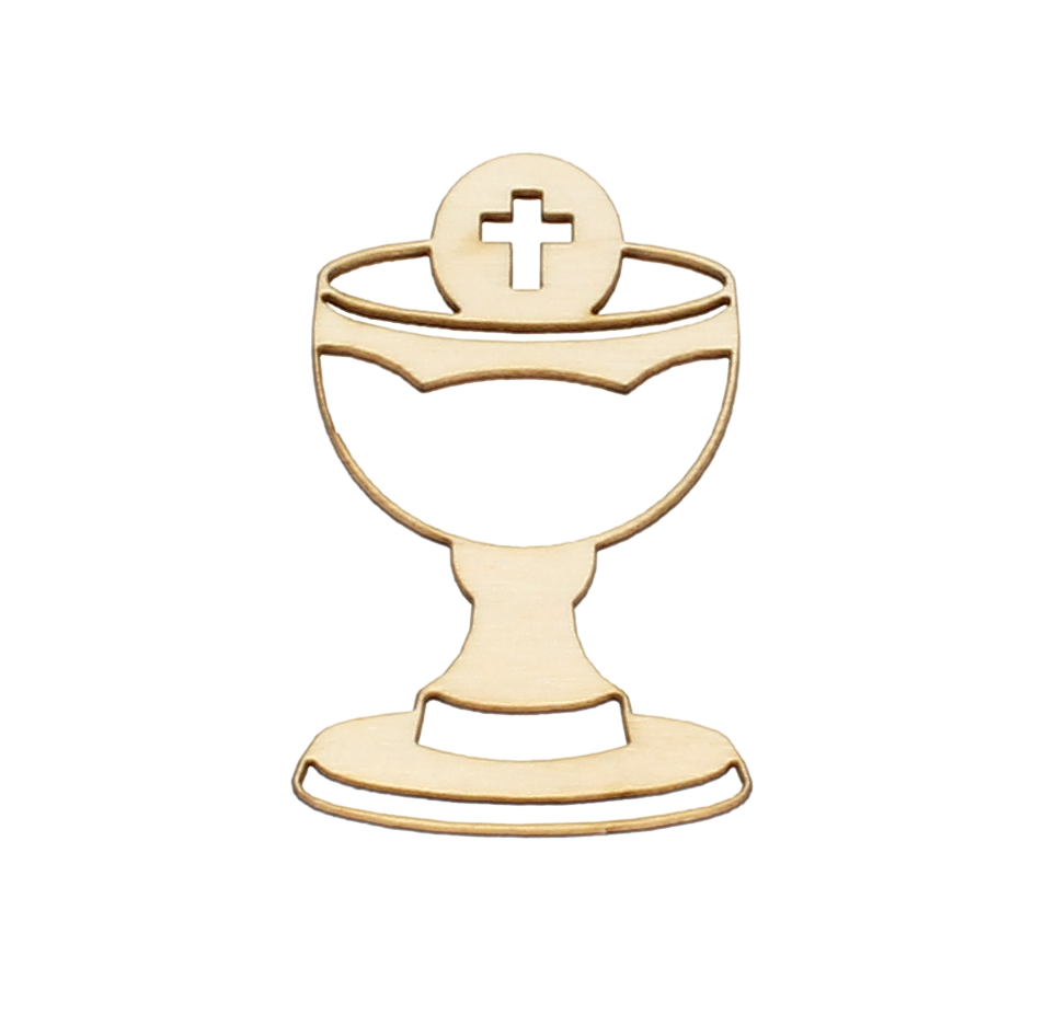 Dekoracja ze sklejki przedstawia kielich z hostią. Dekoracja sprawdzi się na zaproszeniach, podziękowaniach i albumach komunijnych oraz tych z okazji Chrztu Świętego.