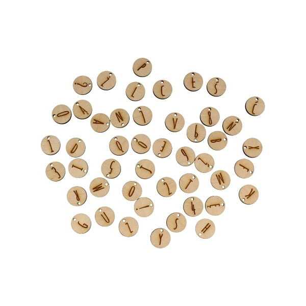 Literki grawerowane na okrągłych tabliczkach ze sklejki można zawiesić. Jeśli chcesz tabliczki bez otworka, dopisz nam taką uwagę po zakupie.