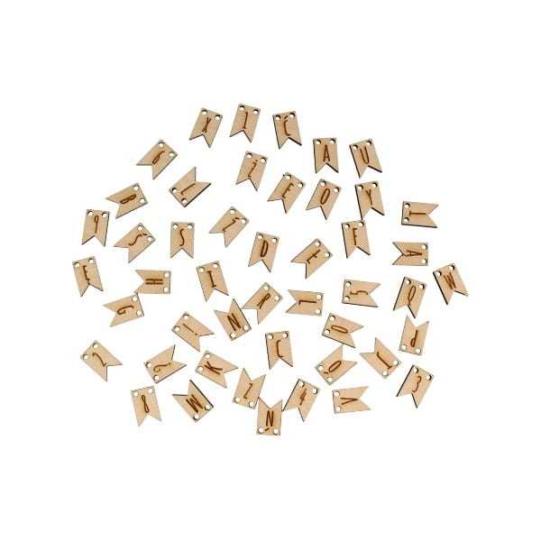 Literki grawerowane na malutkich proporczykach ze sklejki można zawiesić na sznureczku.