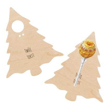 Dekor wykonany ze sklejki dopasowany do popularnych lizaków będzie miłym dodatkiem na różne okazje. Na choince możemy umieścić imię, datę lub inny krótki tekst. Pamiętaj, by podać go podczas składania zamówienia.