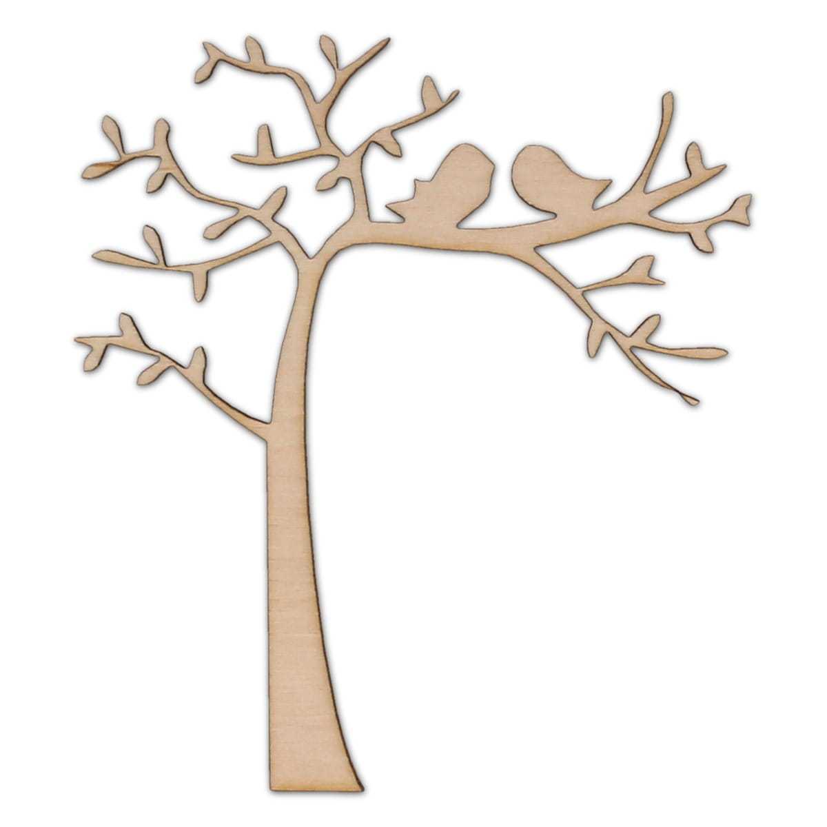 Dekoracja ze sklejki w kształcie drzewa z siedzącymi na nim ptakami.
