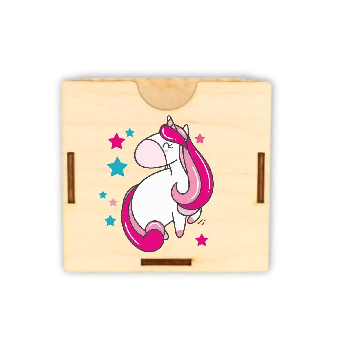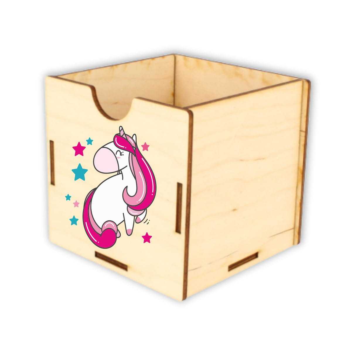 Dobrze zorganizowana przestrzeń to podstawa do nauki i zabawy. Drewniane pojemniki na akcesoria szkolne: kredki, mazaki, długopisy, pomogą zorganizować przestrzeń na biurku dziecka. Na froncie pojemnika nadrukowany jest kolorowy jednorożec.