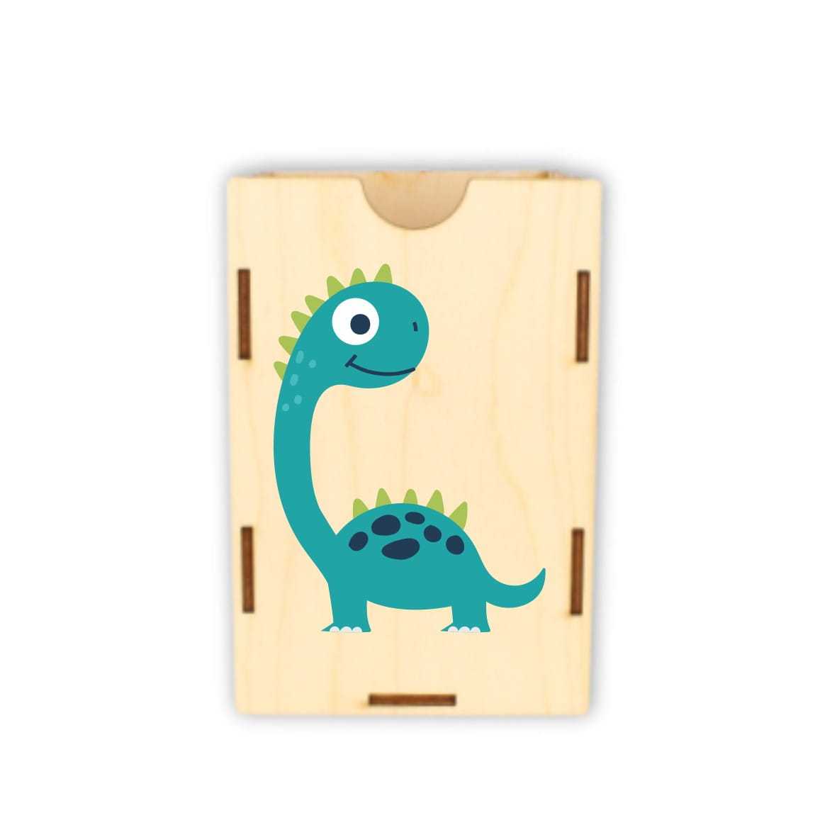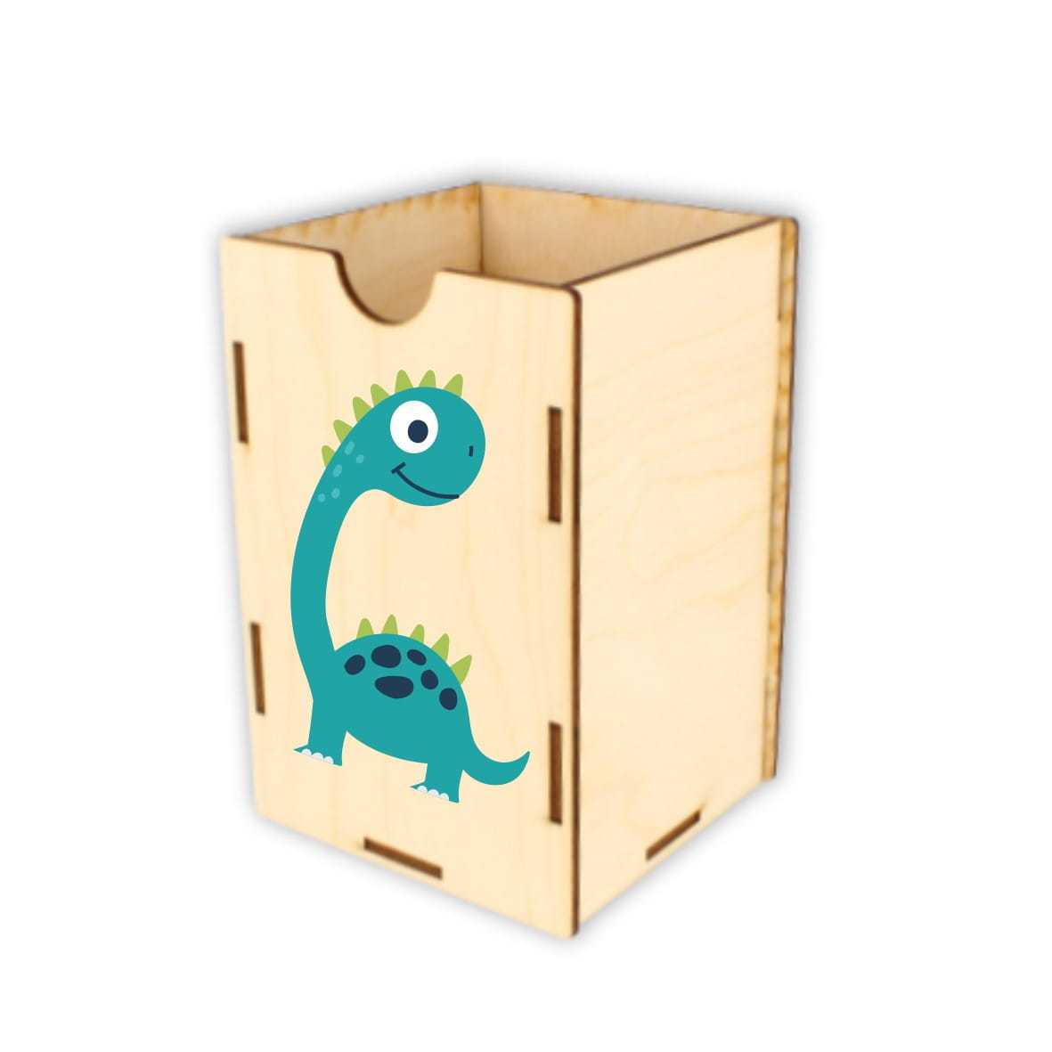 Dobrze zorganizowana przestrzeń to podstawa do nauki i zabawy. Drewniane pojemniki na akcesoria szkolne: kredki, mazaki, długopisy, pomogą zorganizować przestrzeń na biurku dziecka. Na froncie pojemnika nadrukowany jest kolorowy dinozaur.