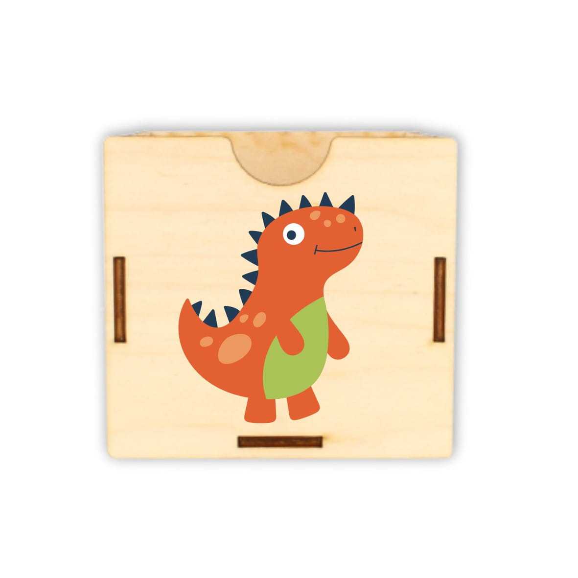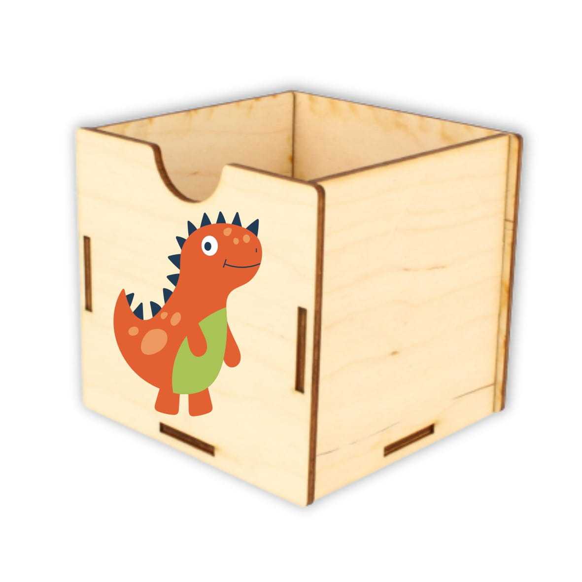 Dobrze zorganizowana przestrzeń to podstawa do nauki i zabawy. Drewniane pojemniki na akcesoria szkolne: kredki, mazaki, długopisy, pomogą zorganizować przestrzeń na biurku dziecka. Na froncie pojemnika nadrukowany jest kolorowy dinozaur.