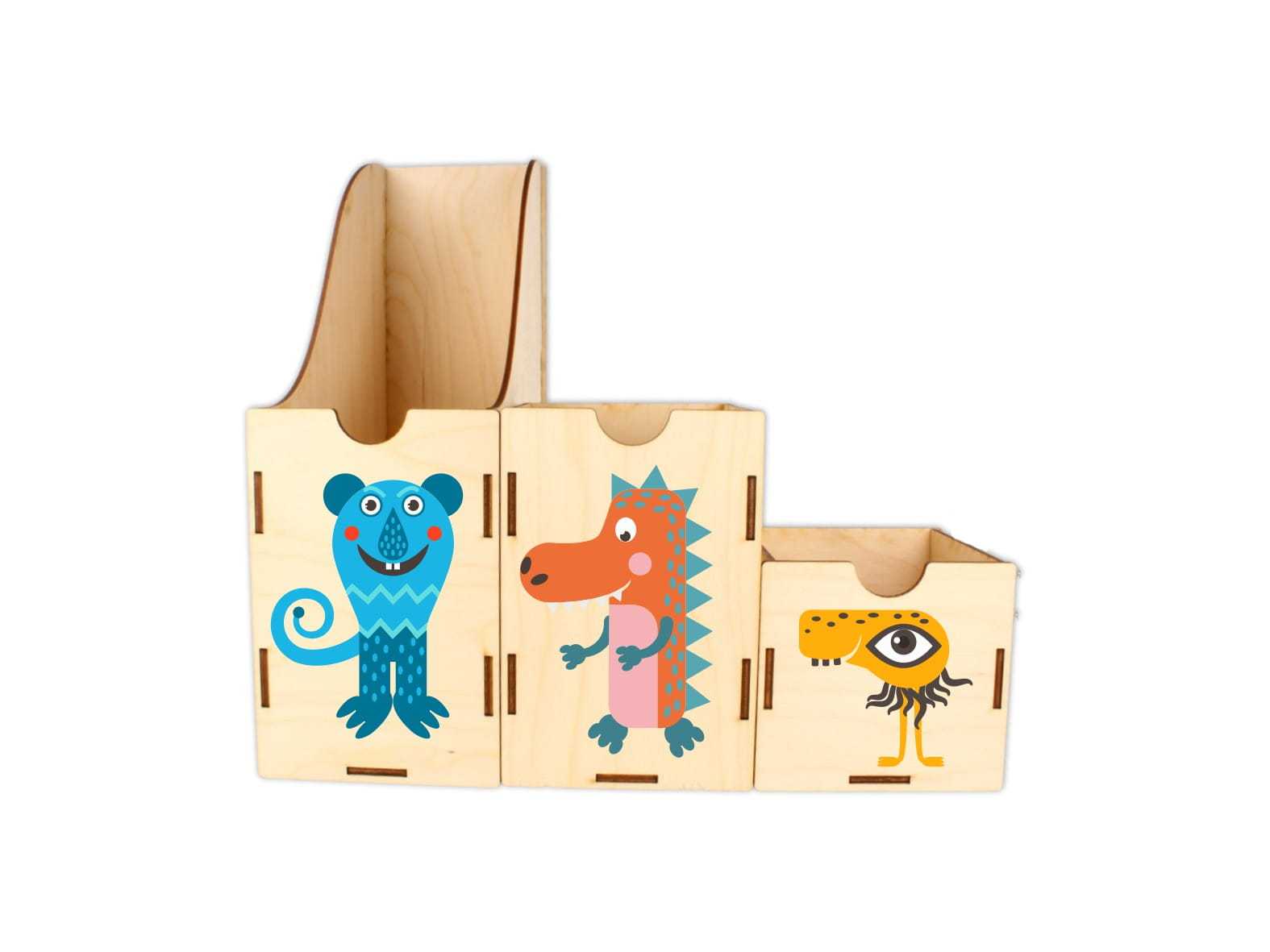 Dobrze zorganizowana przestrzeń to podstawa do nauki i zabawy. Drewniane pojemniki na akcesoria szkolne i kartki pomogą zorganizować przestrzeń na biurku dziecka. Zestaw składa się z trzech pojemników o różnych wielkościach. Na froncie pojemników nadrukowane są kolorowe sympatyczne potworki.