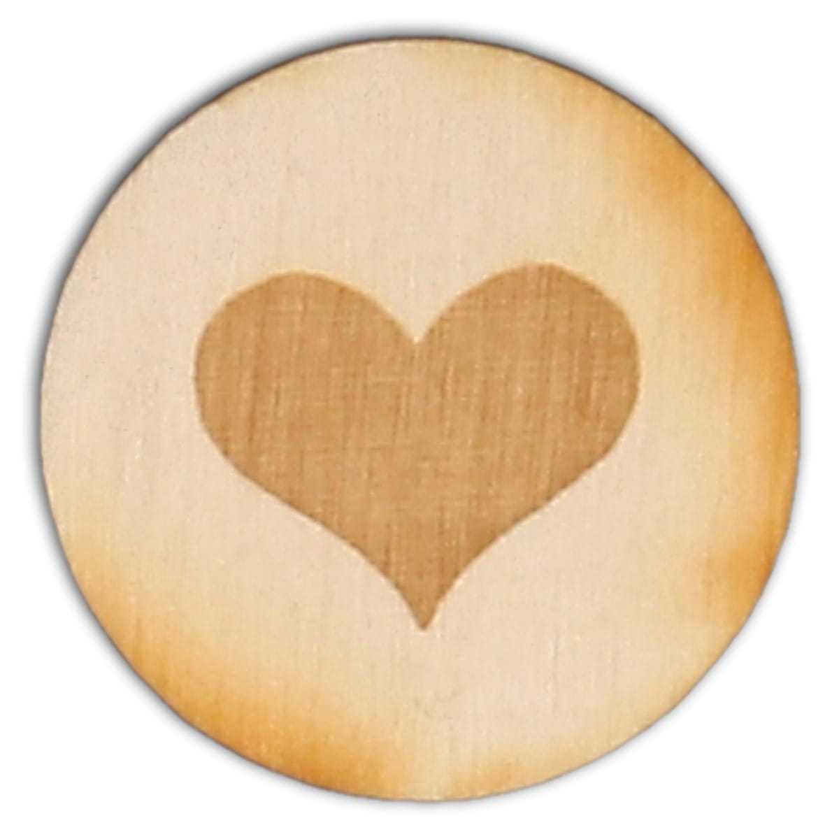 Drewniany badzik z wygrawerowanym sercem o średnicy 2,5 cm wykonany ze sklejki o grubości 3 mm.