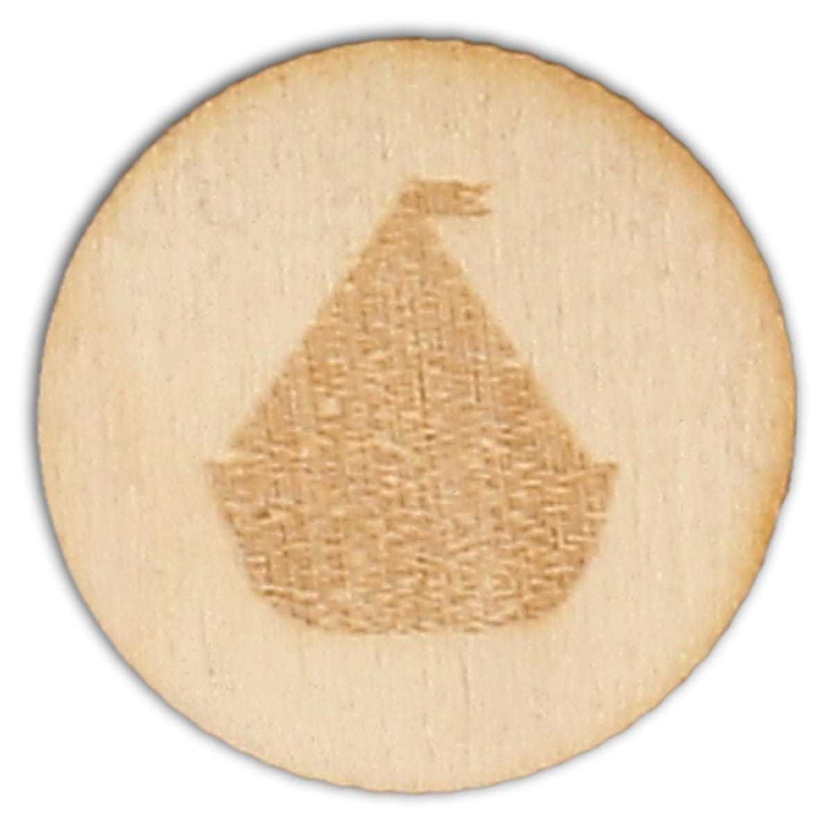 Drewniany badzik o średnicy 2,5 cm z wygrawerowaną łódką wykonany ze sklejki o grubości 3 mm.