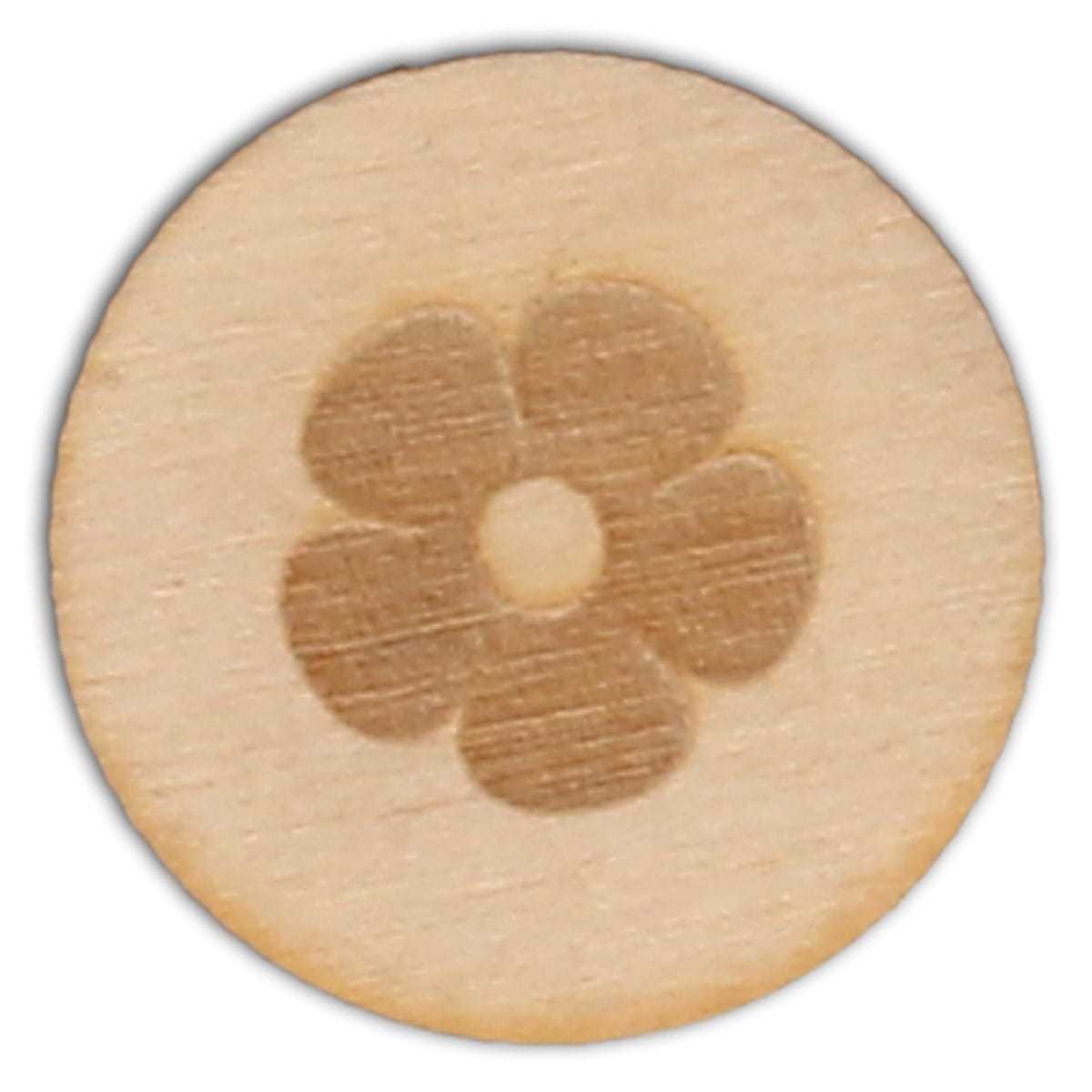Drewniany badzik o średnicy 2,5 cm z wygrawerowanym kwiatkiem wykonany ze sklejki o grubości 3 mm.