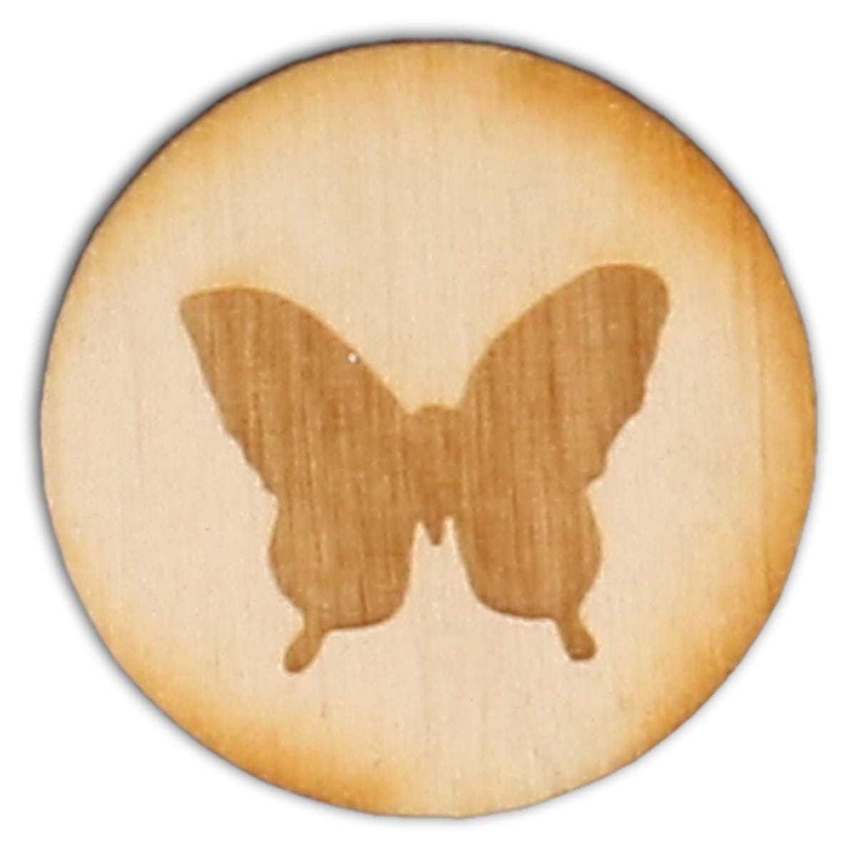 Drewniany badzik o średnicy 2,5 cm z wygrawerowanym motylkiem wykonany ze sklejki o grubości 3 mm.