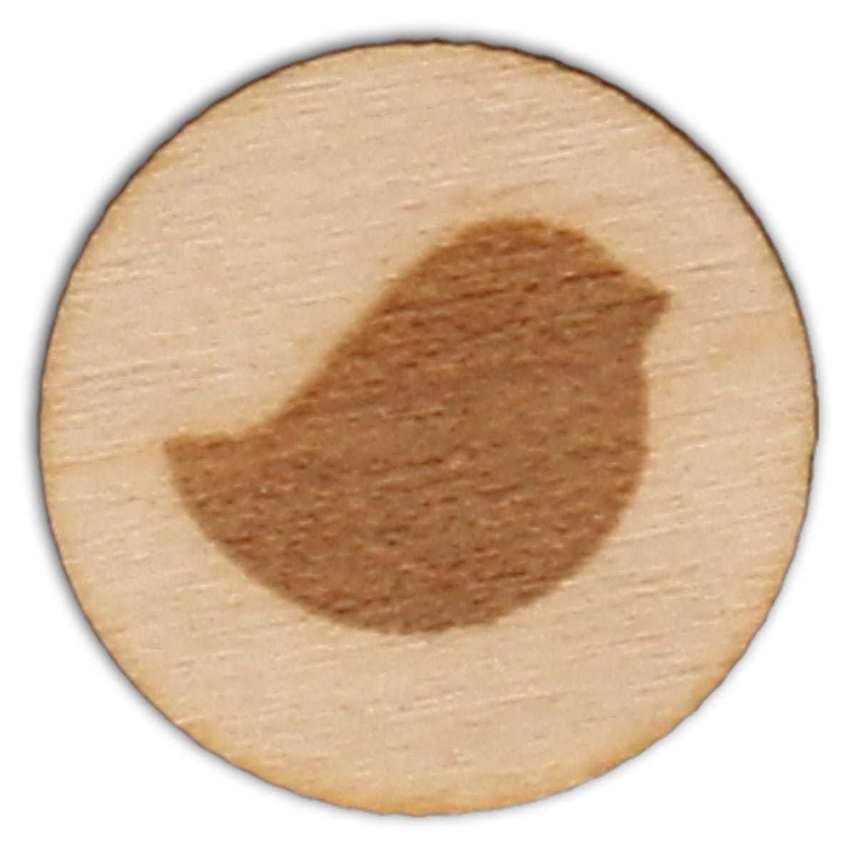 Drewniany badzik o średnicy 2,5 cm z wygrawerowanym ptaszkiem wykonany ze sklejki o grubości 3 mm.