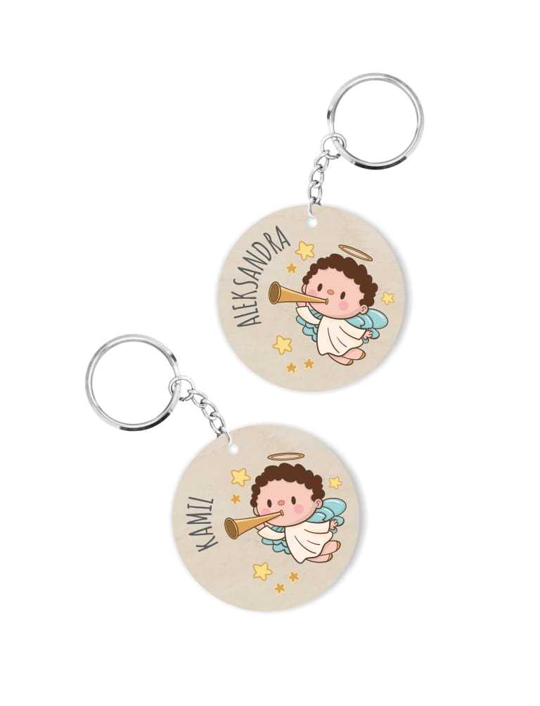 Drewniany brelok z nadrukiem kolorowego aniołka. Po zakupie podaj, jakie imię mamy umieścić na breloku.