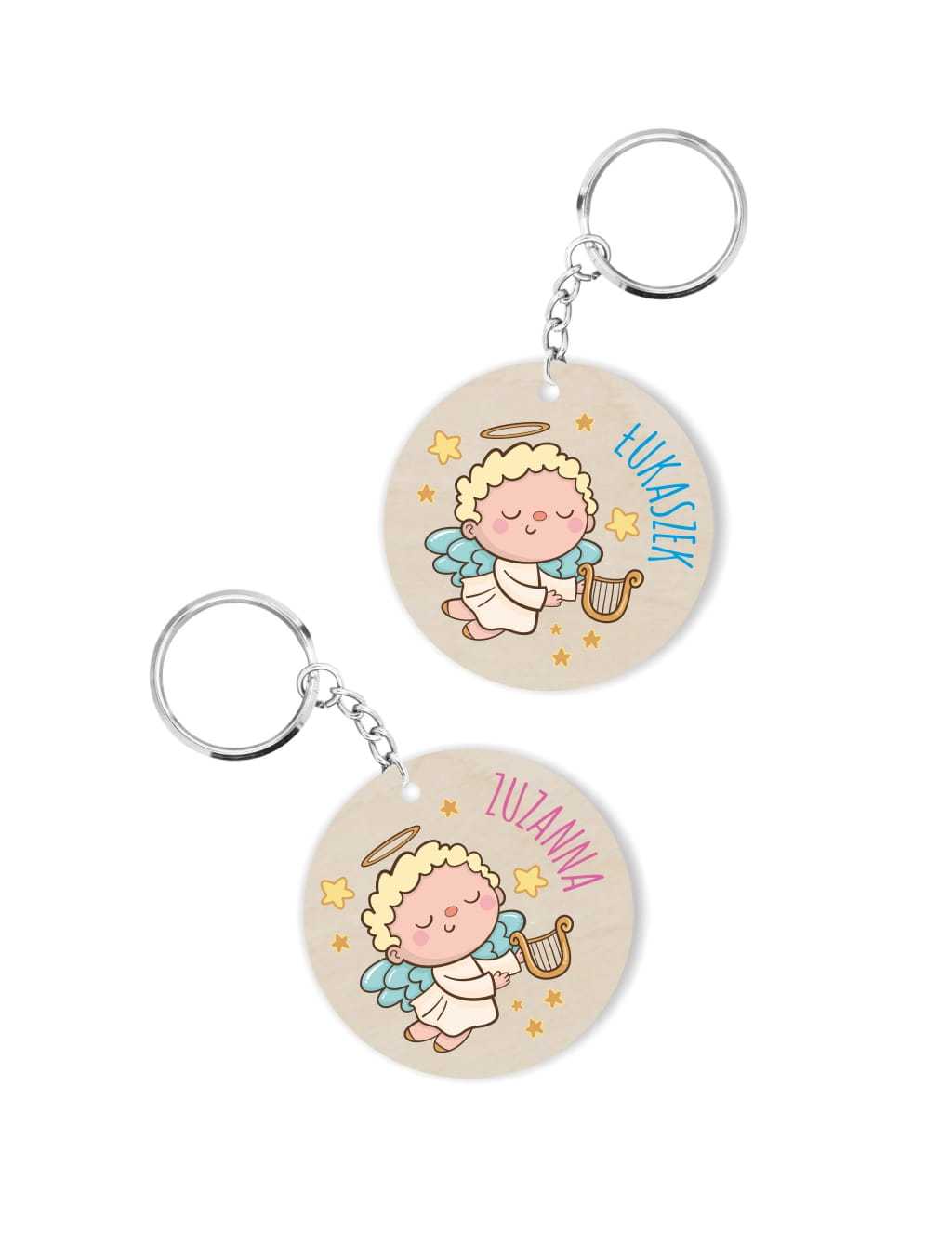 Drewniany brelok z nadrukiem kolorowego aniołka. Po zakupie podaj, jakie imię mamy umieścić na breloku.