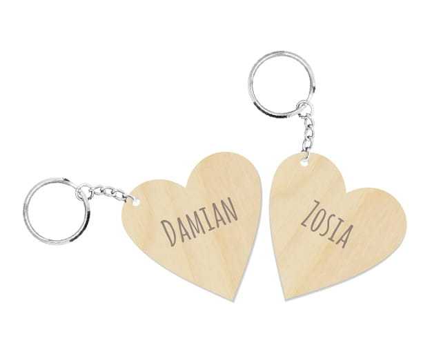 Dwa breloki wykonane ze sklejki z wygrawerowanymi imionami (zamiast imion możemy umieścić dowolne słowo lub np. datę).