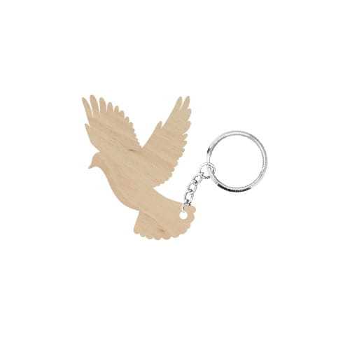 Drewniany brelok z motywem gołębia.