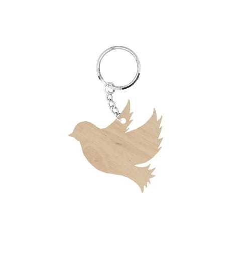 Drewniany brelok z motywem gołębia.