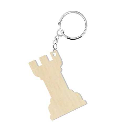 Drewniany brelok w kształcie wieży szachowej do samodzielnego montażu.