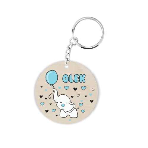 Drewniany brelok z nadrukiem kolorowego słonika. Po zakupie podaj, jakie imię mamy umieścić na breloku.