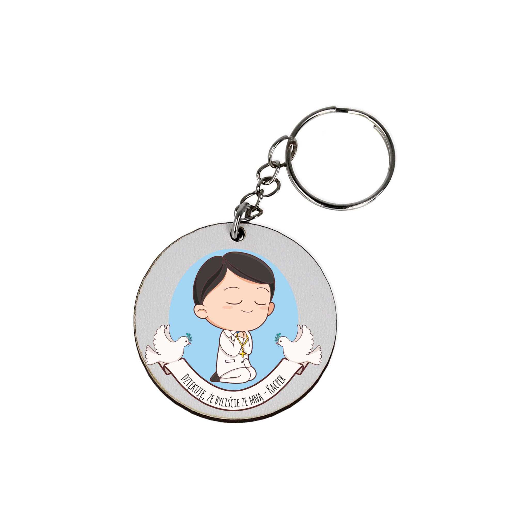 BD286HDF-UV Brelok biały z imieniem - podziękowanie na Komunię niebieski