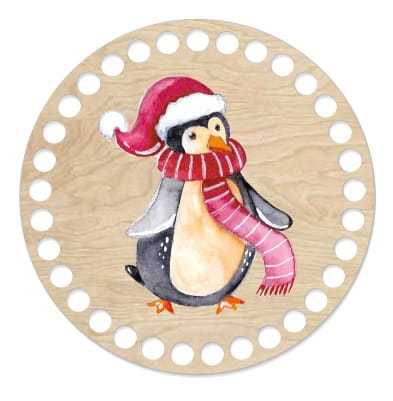 Baza pod szydełkowy koszyk w kształcie koła ułatwi uzyskanie foremnego wzoru. Dodatkowym elementem dekoracyjnym jest nadrukowana grafika przedstawiająca świątecznego pingwina. Dzięki oryginalnej bazie stworzysz wyjątkowy koszyczek na drobiazgi i podkreślisz charakter wnętrza ciekawym detalem.
