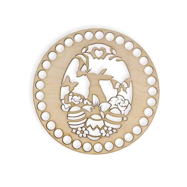 Baza pod szydełkowy koszyk w kształcie koła ułatwi uzyskanie foremnego wzoru. Dodatkowym elementem dekoracyjnym jest ozdobny ażurowy wzór w tematyce wielkanocnej.