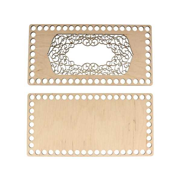 Baza pod szydełkowy chustecznik w kształcie prostokąta ułatwi uzyskanie foremnego wzoru. Zestaw zawiera wieko z otworem i podstawę.