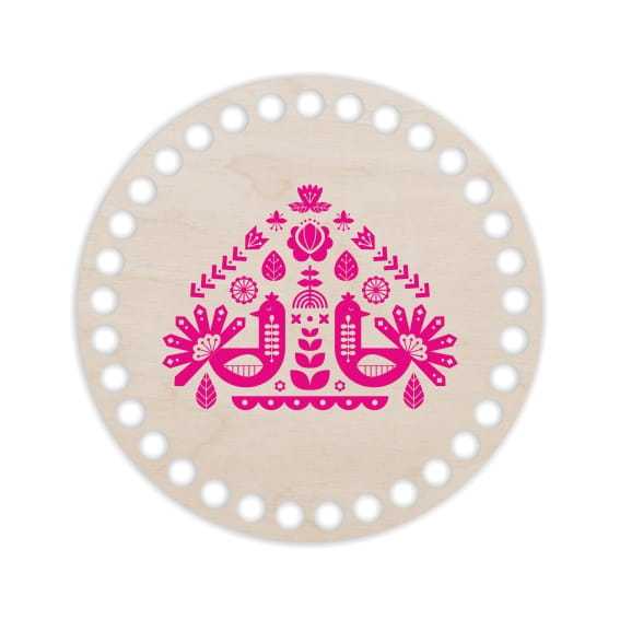 Baza pod szydełkowy koszyk w kształcie koła ułatwi uzyskanie foremnego wzoru. Dodatkowym elementem dekoracyjnym jest różowy nadruk z ludowymi motywami.