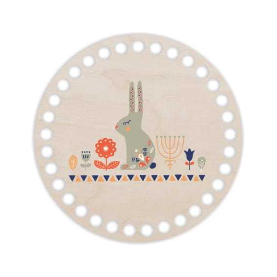 Baza pod szydełkowy koszyk w kształcie koła ułatwi uzyskanie foremnego wzoru. Dodatkowym elementem dekoracyjnym jest kolorowy nadruk z zającem.