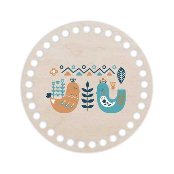 Baza pod szydełkowy koszyk w kształcie koła ułatwi uzyskanie foremnego wzoru. Dodatkowym elementem dekoracyjnym jest nadrukowany motyw ludowy z ptaszkami w kolorystyce złotawo turkusowym.