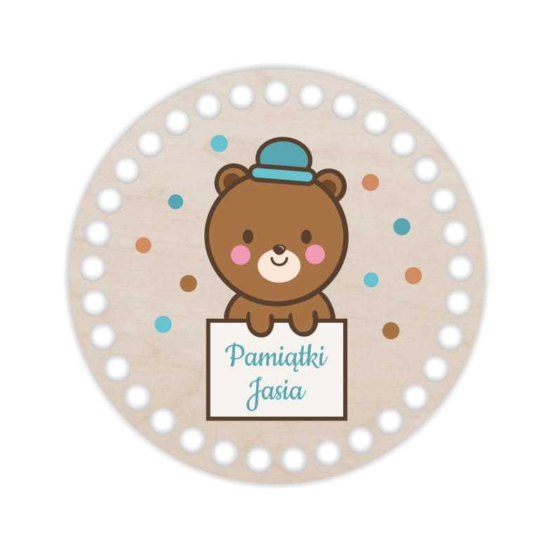 Baza pod szydełkowy koszyk w kształcie koła ułatwi uzyskanie foremnego wzoru. Dodatkowym elementem dekoracyjnym jest nadrukowana kolorowa grafika przedstawiająca misia i napis "Pamiątki Jasia". Imię na nadruku może być zmienione na życzenie klienta podczas składania zamówienia. Dzięki oryginalnej bazie stworzysz wyjątkowy koszyczek na skarby małego odkrywcy.