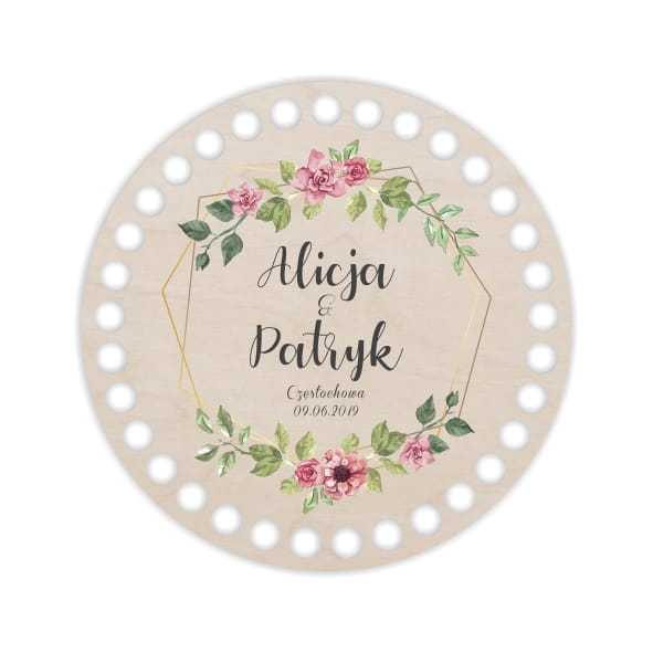Baza pod szydełkowy koszyk w kształcie koła ułatwi uzyskanie foremnego wzoru. Dodatkowym elementem dekoracyjnym jest nadrukowany delikatny motyw kwiatów, data i imiona nowożeńców. Imiona i data na nadruku mogą być zmienione na życzenie klienta.