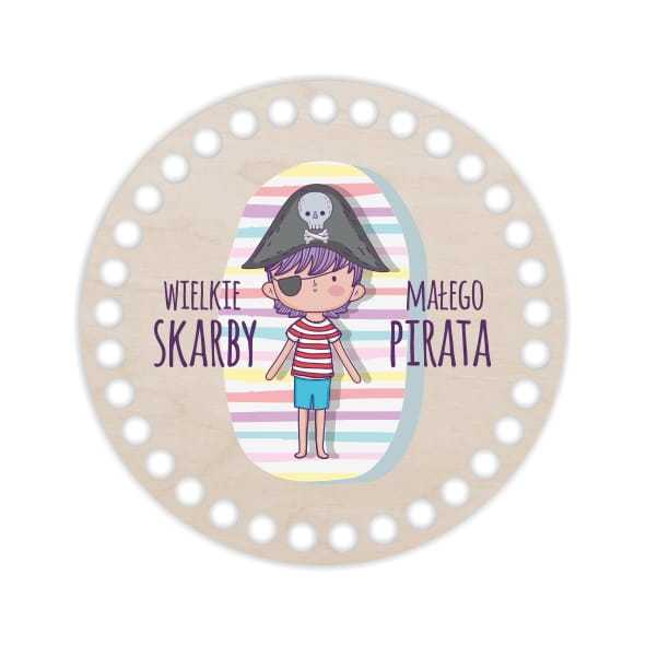Baza pod szydełkowy koszyk w kształcie koła ułatwi uzyskanie foremnego wzoru. Dodatkowym elementem dekoracyjnym jest nadrukowana kolorowa grafika przedstawiająca pirata i napis "Wielkie skarby małego pirata". Dzięki oryginalnej bazie stworzysz wyjątkowy koszyczek na niezapomniane pamiątki z wypraw dla małego odkrywcy.