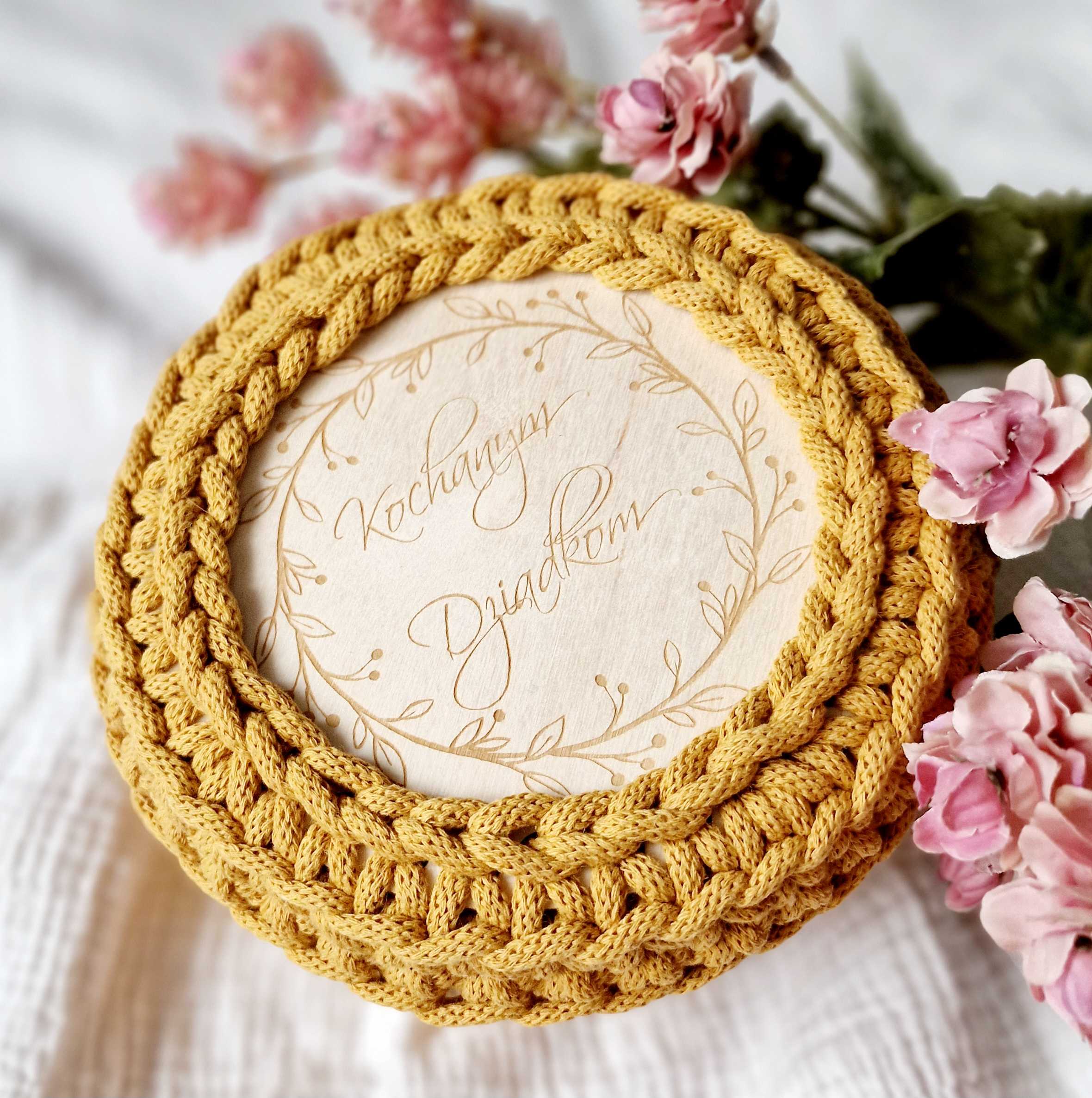 Baza pod szydełkowy koszyk lub tacę w kształcie koła ułatwi uzyskanie foremnego wzoru. Dodatkowym elementem dekoracyjnym jest nadrukowany motyw. Dzięki oryginalnej bazie stworzysz wyjątkowy przedmiot i podkreślisz charakter wnętrza ciekawym detalem.