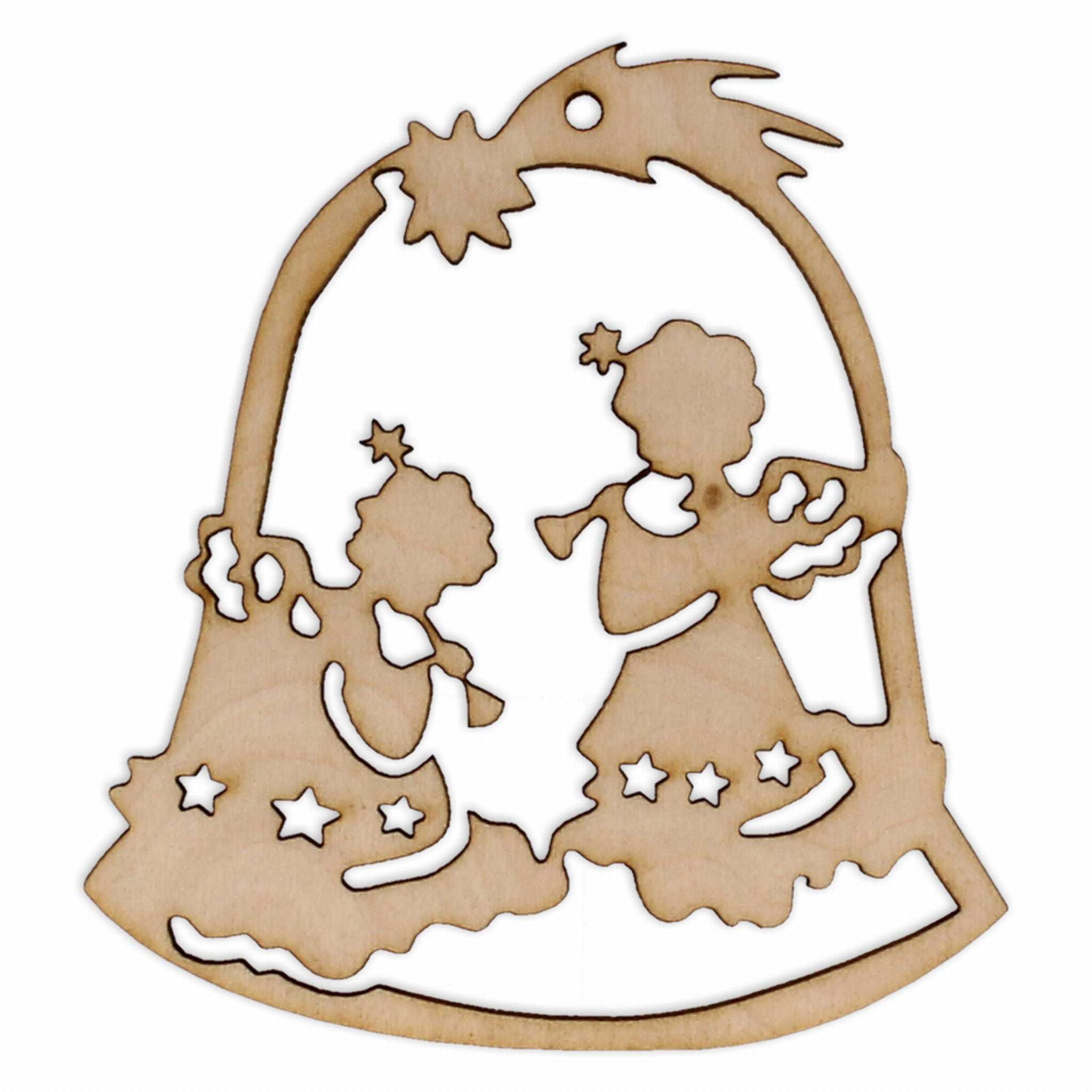 Świąteczny dekor prezentujący parę aniołków na chmurkach w trakcie przygrywania kolęd. Zdobione motywami nawiązującymi do świąt - gwiazdki oraz gwiazda betlejemska. Dekor posiada dziurkę, która pozwala na zawieszenie elementu na choince. czy tez w innym dowolnym miejscu. Sklejka ma grubość 3mm, a zawieszka jest precyzyjnie wycięta i prosta w ozdabianiu.
