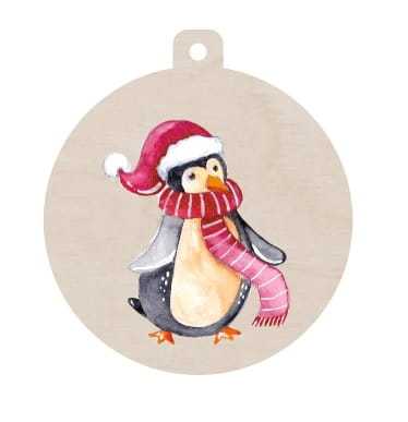 Bombka wykonana ze sklejki ozdobiona świątecznym motywem w technologii wysokiej jakości druku UV. Bombka może też pełnić funkcję bileciku prezentowego.