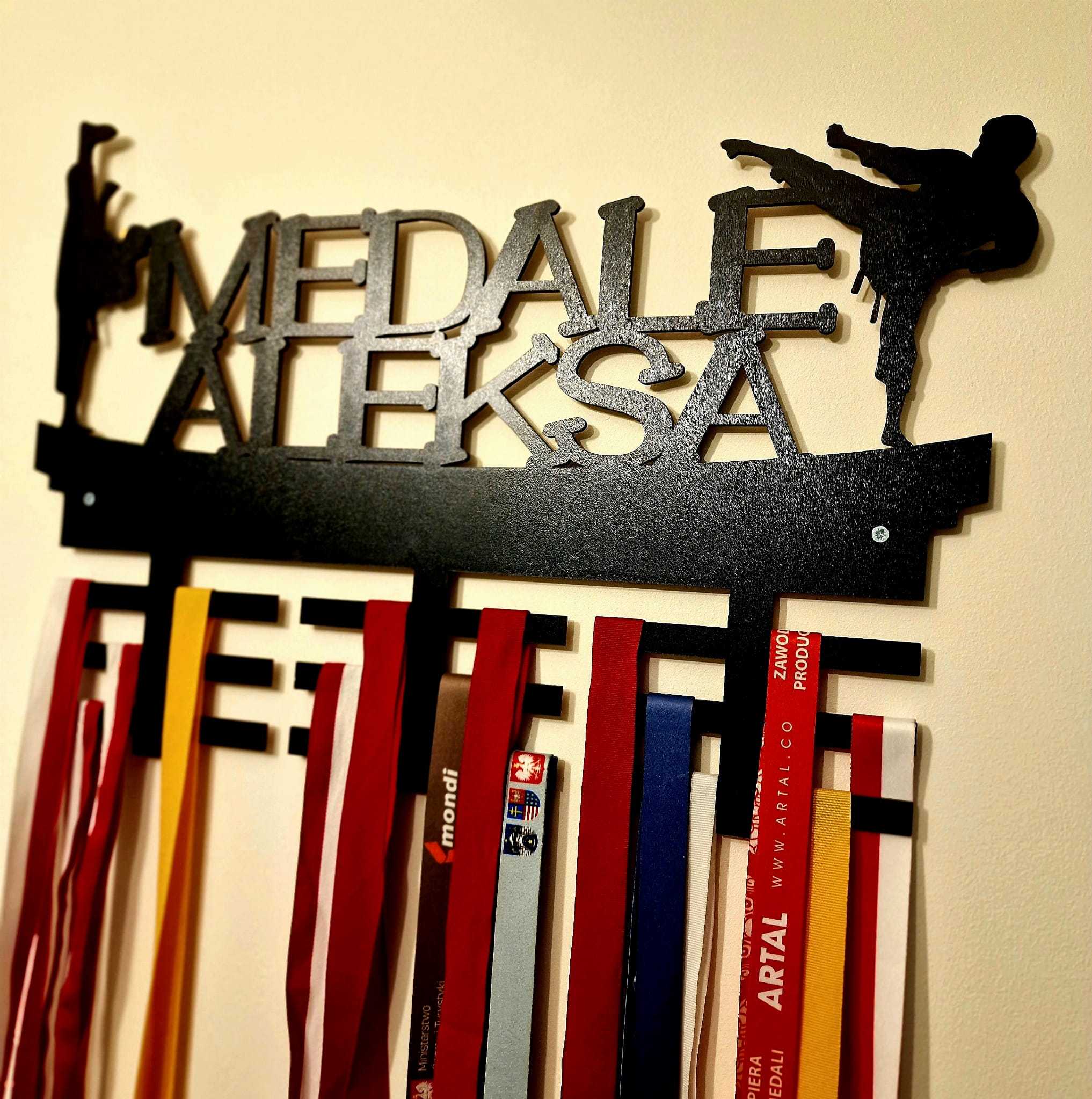 Wieszak na sportowe medale wykonany jest z płyty HDF w kolorze czarnym. Na wieszaku umieszczone jest imię wybrane w czasie zakupu.