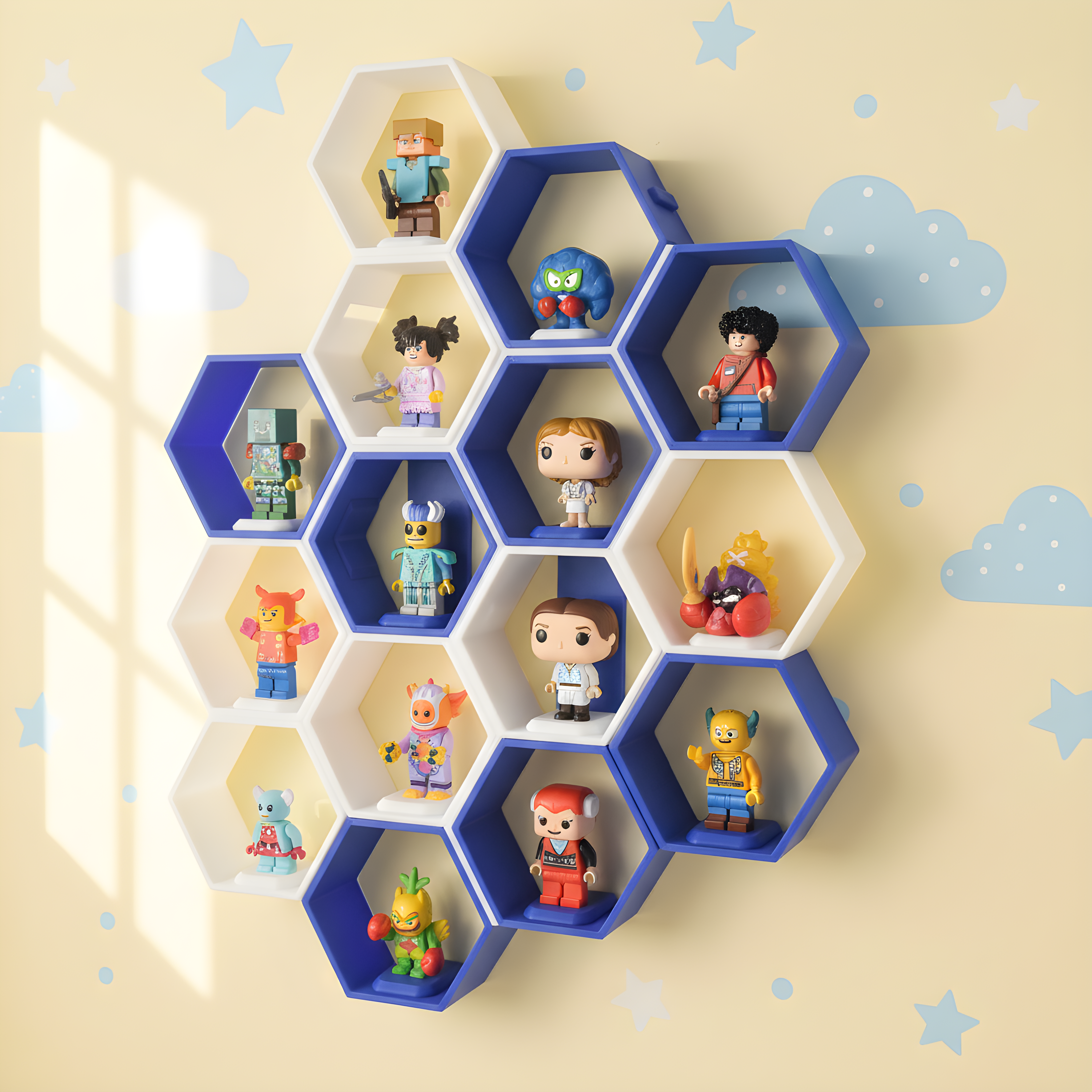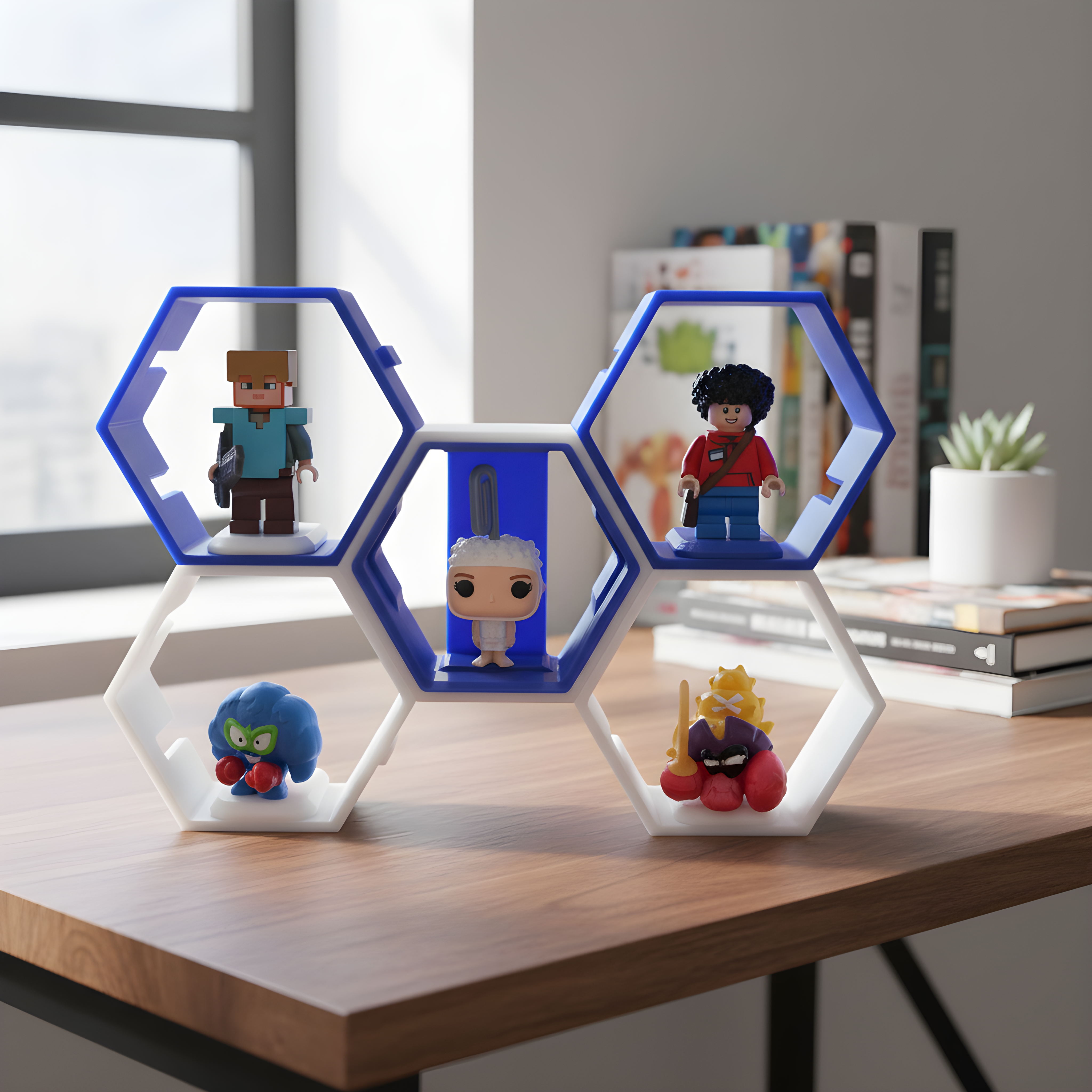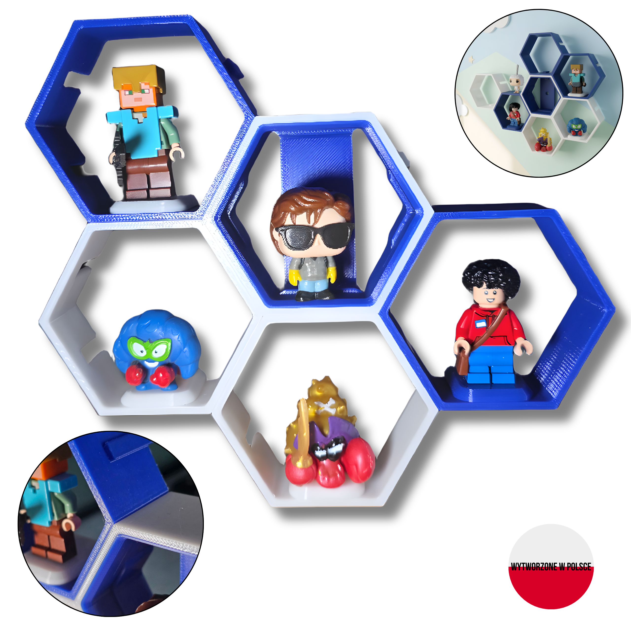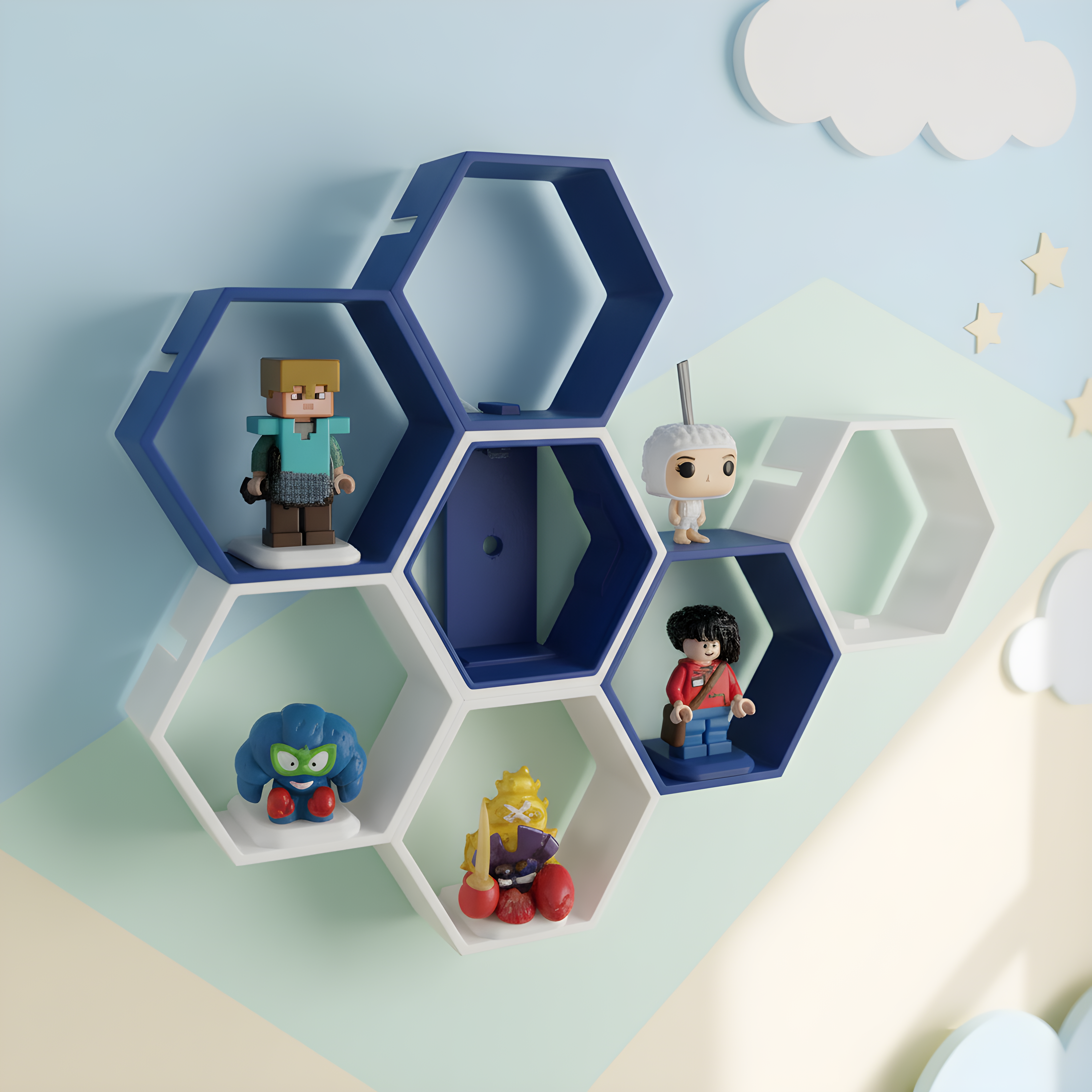 Heksagonalne półki ścienne drukowane w technologii 3D to idealne rozwiązanie do ekspozycji figurek, zabawek i drobnych dekoracji w pokoju dziecka, salonie lub kąciku kolekcjonerskim.