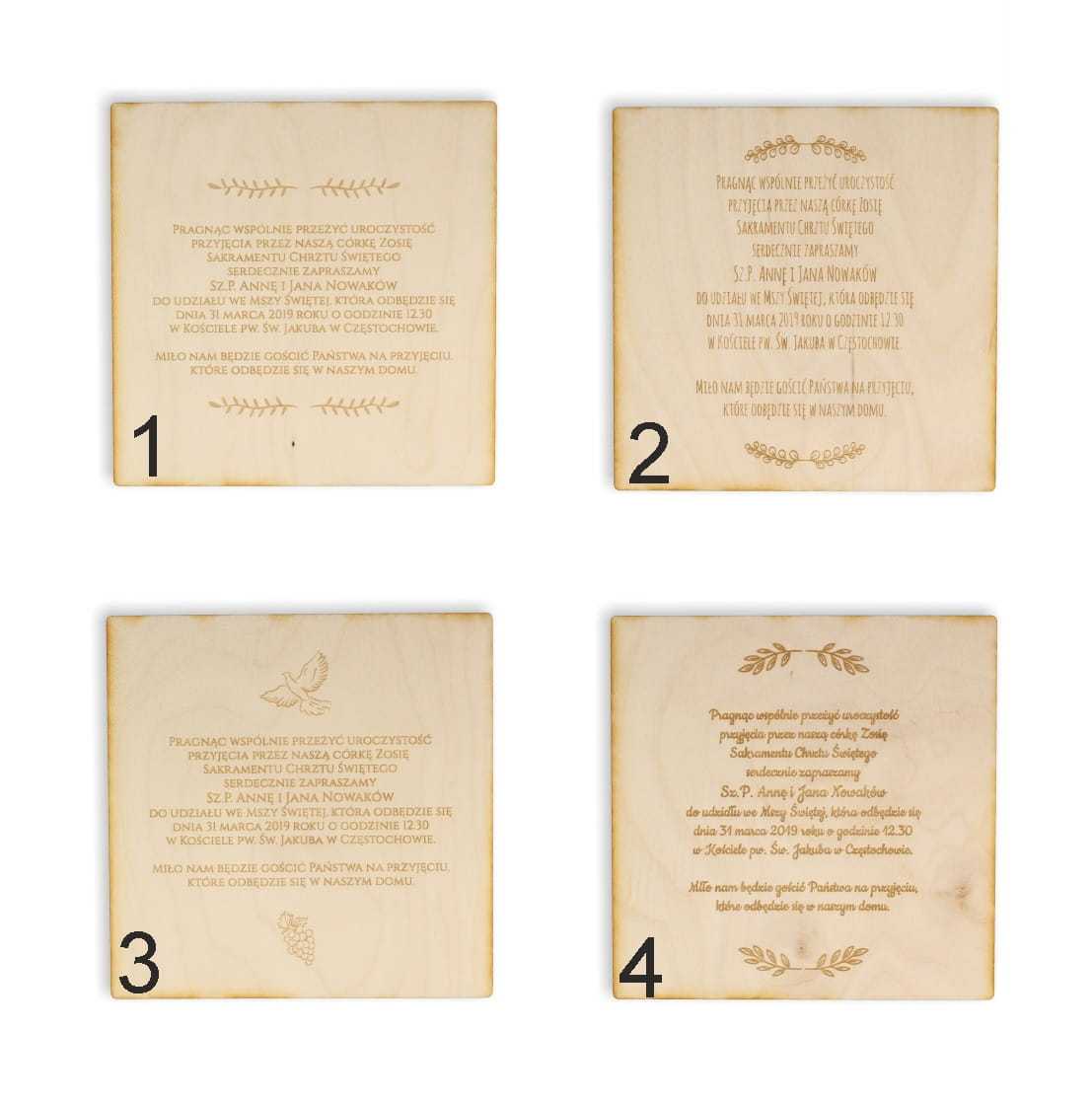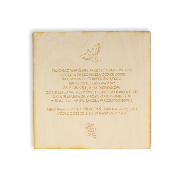 Piękne, drewniane zaproszenie na uroczystość Chrztu Świętego. Zaproszenie składa się z 3 elementów: ramki z wyciętym kółkiem, na którym znajduje się grawer oraz drugiej strony, na której umieszczona jest treść zaproszenia.