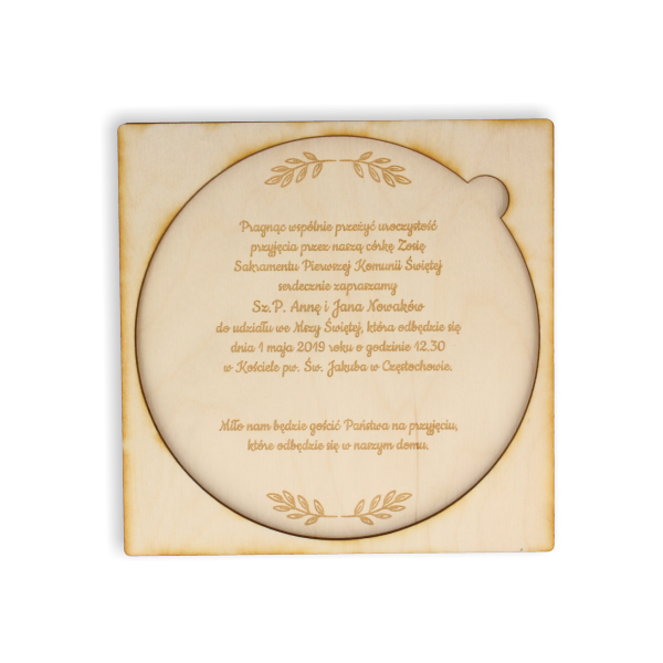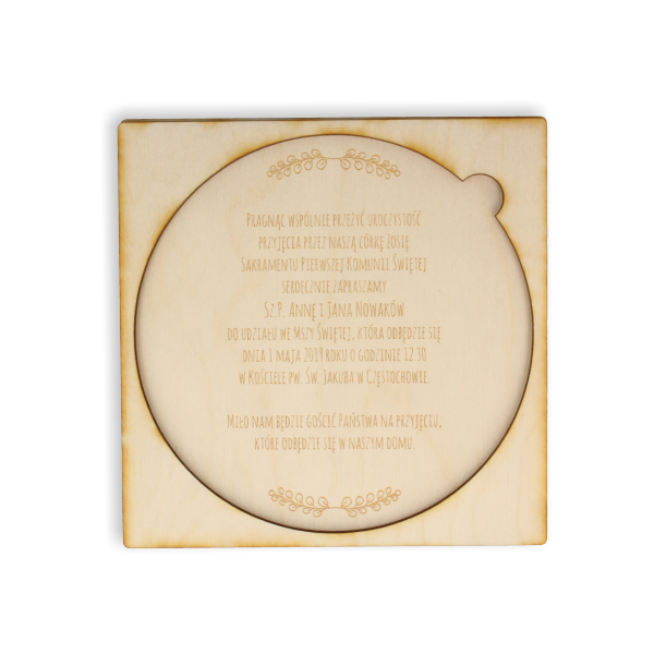 Piękne, drewniane zaproszenie na uroczystość Pierwszej Komunii Świętej. Zaproszenie składa się z 3 elementów: ramki z wyciętym kółkiem, na którym znajduje się grawer oraz drugiej strony, na której umieszczona jest treść zaproszenia.