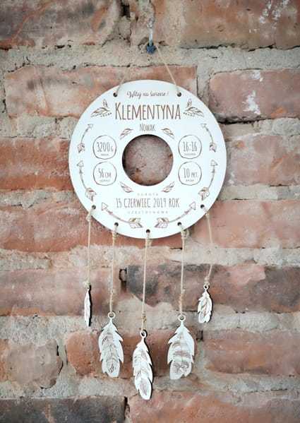 Łapacz snów wykonany jest z białej płyty HDF o grubości 3 mm. W górnej części (metryczka) wygrawerowane są najważniejsze informacje dotyczące narodzin malucha oraz dekoracyjne motywy piórek i strzałek. Po środku metryczki jest otwór o średnicy 65 mm, w którym można umieścić zdjęcie dziecka. Całość utrzymana jest w stonowanej biało beżowej kolorystyce. Do zestawu dołączone są grawerowane piórka (pięć sztuk), które współgrają z całością. Piórka można dołączyć do metryczki za pomocą jutowego lub bawełnianego kolorowego sznurka (sznurek nie jest dołączony do zestawu).