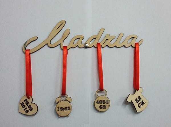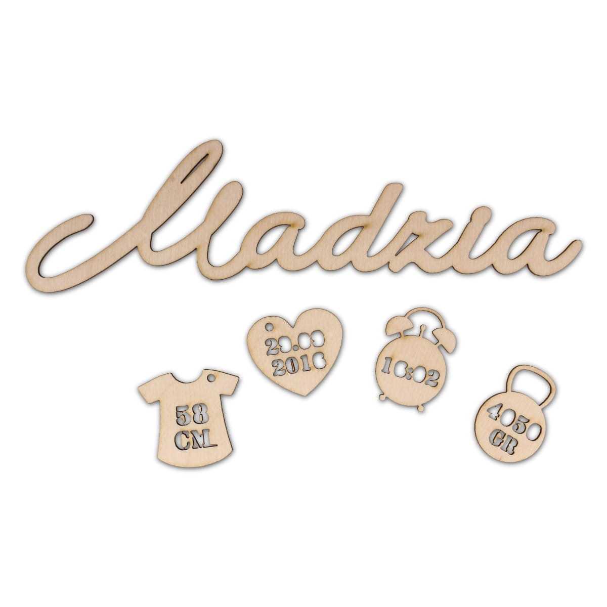 Metryczka dla dziecka z elementami do zawieszenia ze sklejki w kolorze naturalnym.