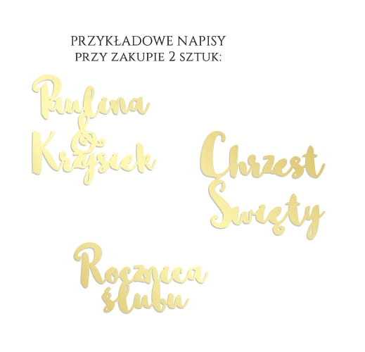 Możemy wykonać dowolny napis - jedno słowo, datę, imię - wg Twojego wyboru (przykłady realizacji na wizualizacji). Jeśli potrzebujesz wyrażenie złożone z dwóch wyrazów, czy np. imiona młodej pary, kup 2 sztuki produktu - wykonamy je połączone ze sobą, jeśli mają to być imiona razem umieścimy pomiędzy nimi symbol "&" (patrz: wizualizacja przykładowych napisów z dwóch wyrazów). Czcionka pokazana jest na zdjęciach w ofercie.