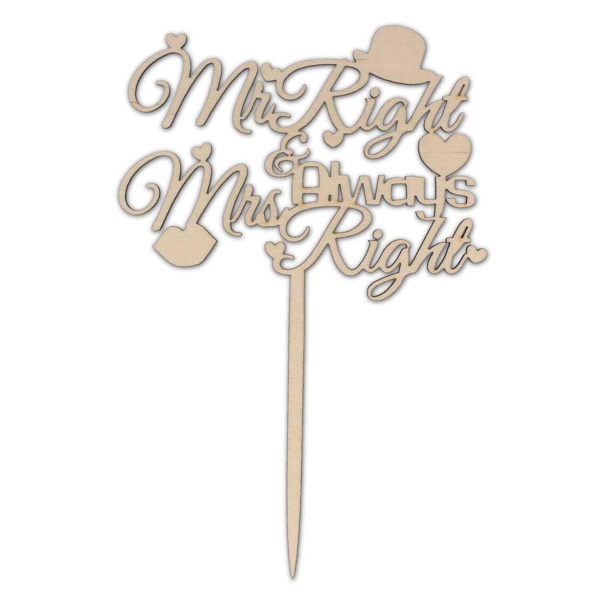 Drewniany topper na tort weselny z tekstem Mr. Right & Mrs. Always Right udekorowany serduszkami.