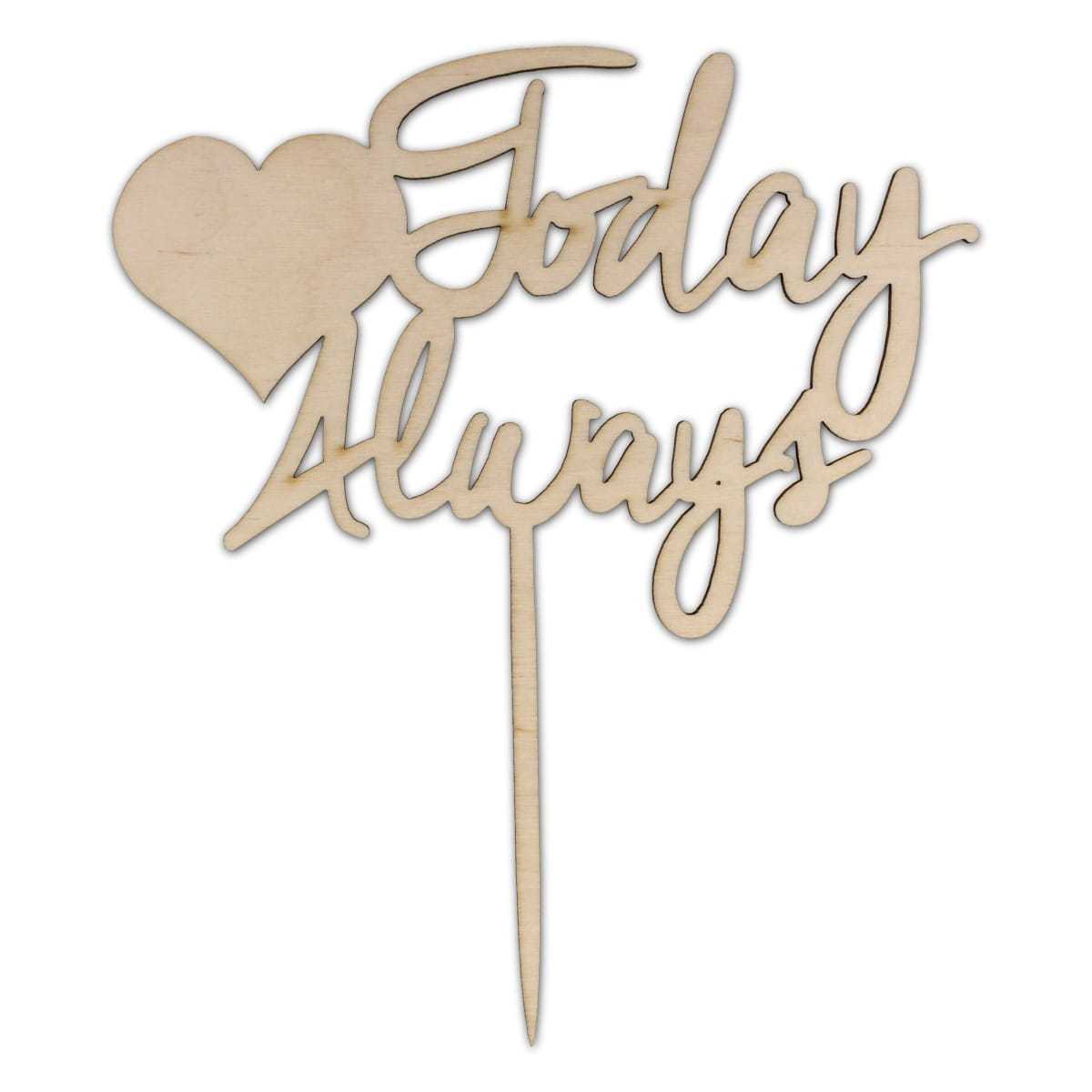 Sklejkowy topper przedstawiający napis TodayAlways połączony sercem. To wersja dla zakochanych, idealna na tort ślubny albo walentynkowy. Bez wątpienia można go użyć jednak na wiele innych okazji, które świętujemy z bliskimi nam osobami. Topper wykonany jest ze sklejki o grubości 3mm. Napis TodayAlways wykonany jest z mocno ozdobnej czcionki. Fikuśne literki idealnie wpasowują się w klimat uczuć i zawirowań miłosnych. Serce, które dopełnia całość jest pełne i wyraziste. Całość umieszczona jest na solidnym patyczku, który możemy wbić w pyszne ciacho.