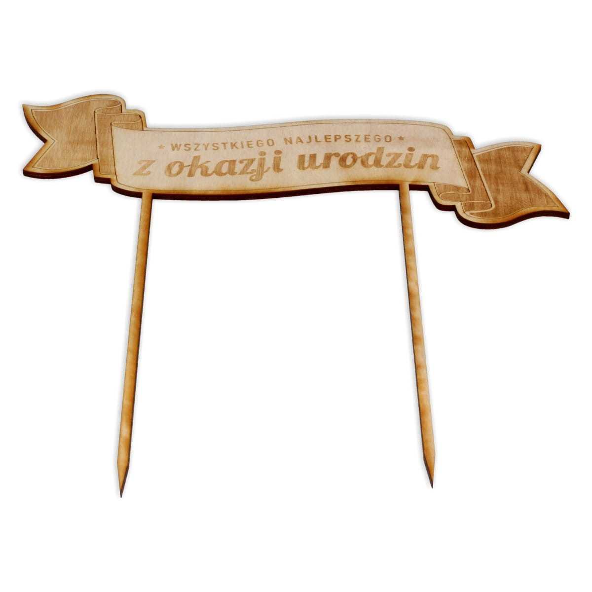 Drewniana wstęga z napisem "Wszystkiego najlepszego z okazji urodzin" będzie znakomitą ozdobą każdego tortu. Topper wykonany jest ze sklejki o grubości 3mm. Cena dotyczy jednej sztuki.