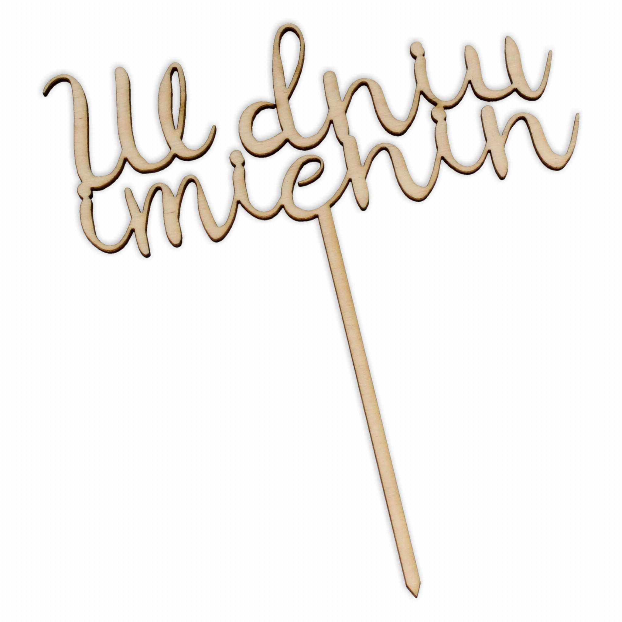 Topper ze sklejki ozdobi tort lub kwiaty z okazji imienin.
