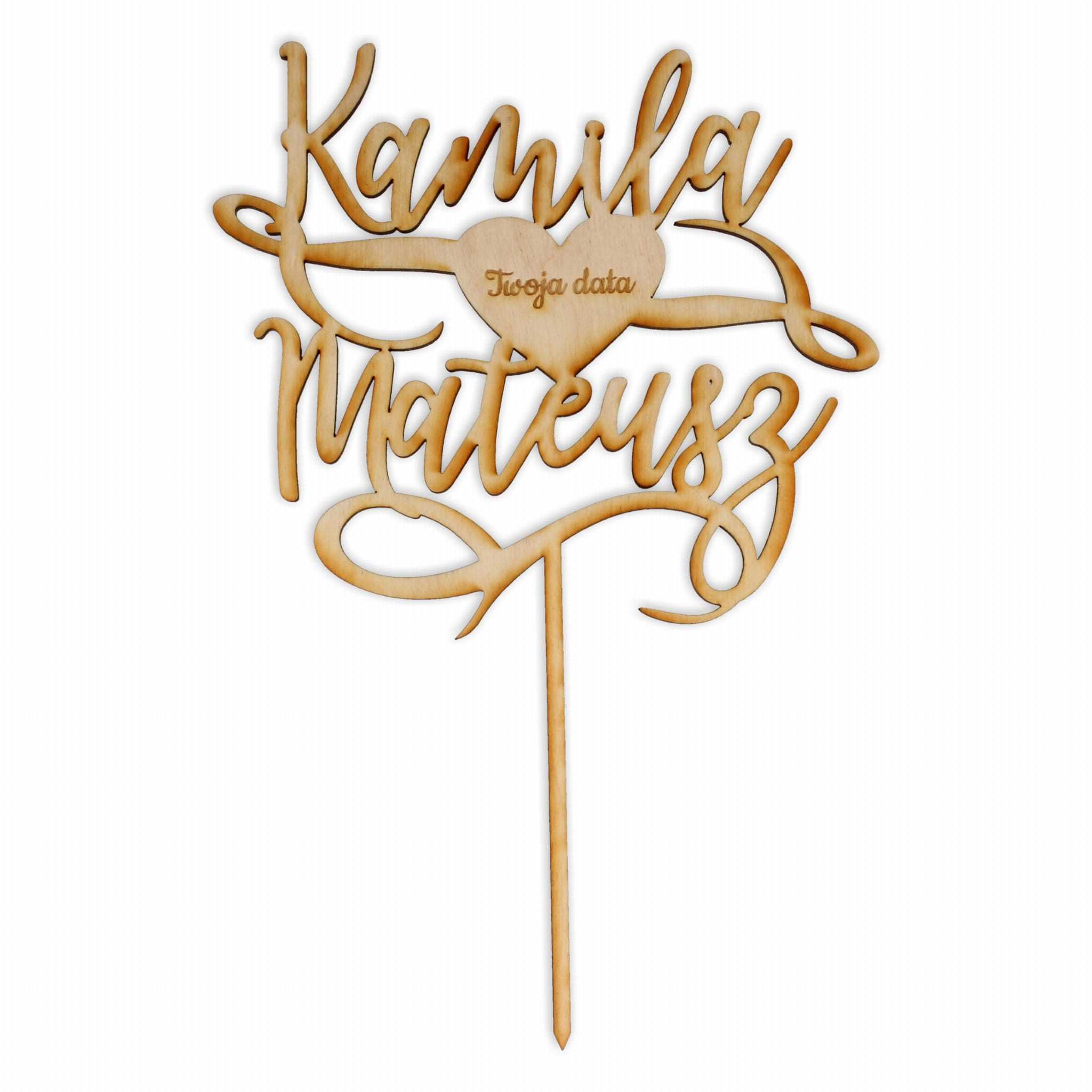 Ozdobny topper ze sklejki udekoruje tort lub bukiet ślubny. Topper zawiera imiona Młodej Pary oraz wygrawerowaną datę ślubu.