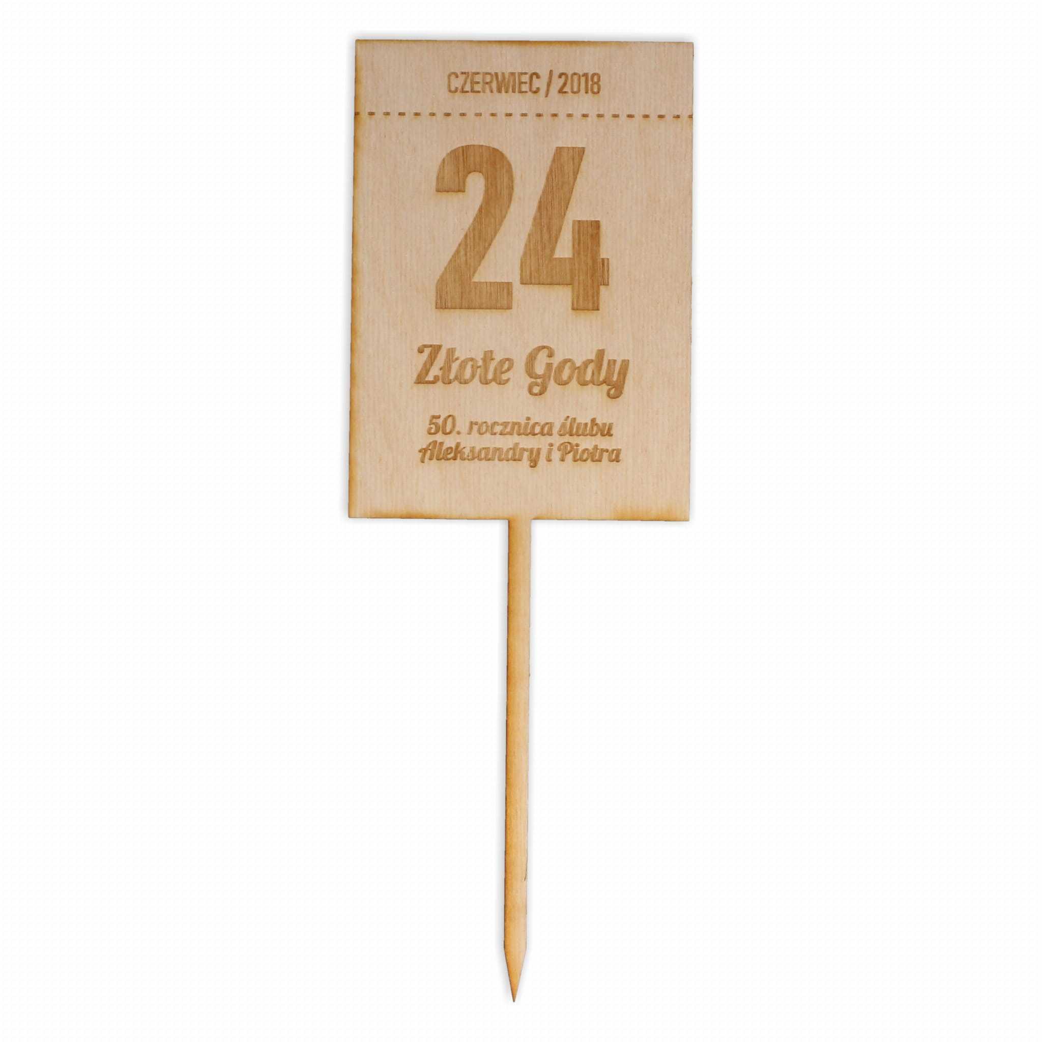 Drewniany topper na rocznicę ślubu, stylizowany na kartkę ze starego kalendarza to wyjątkowy dodatek zarówno do tortu jak i do kwiatów. Wygrawerowane teksty na topperze możemy zmienić zgodnie z życzeniem klienta. Topper wykonany jest ze sklejki o grubości 3 mm. Cena dotyczy jednej sztuki.