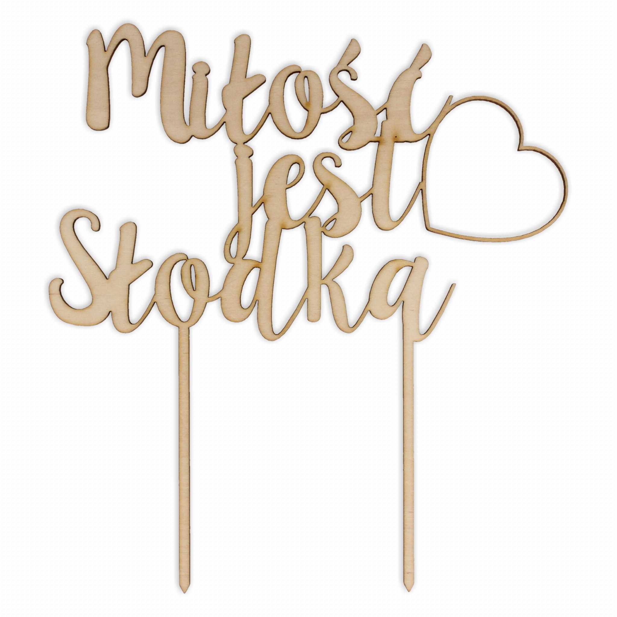 Ozdobny topper ze sklejki udekoruje tort lub bukiet weselny.