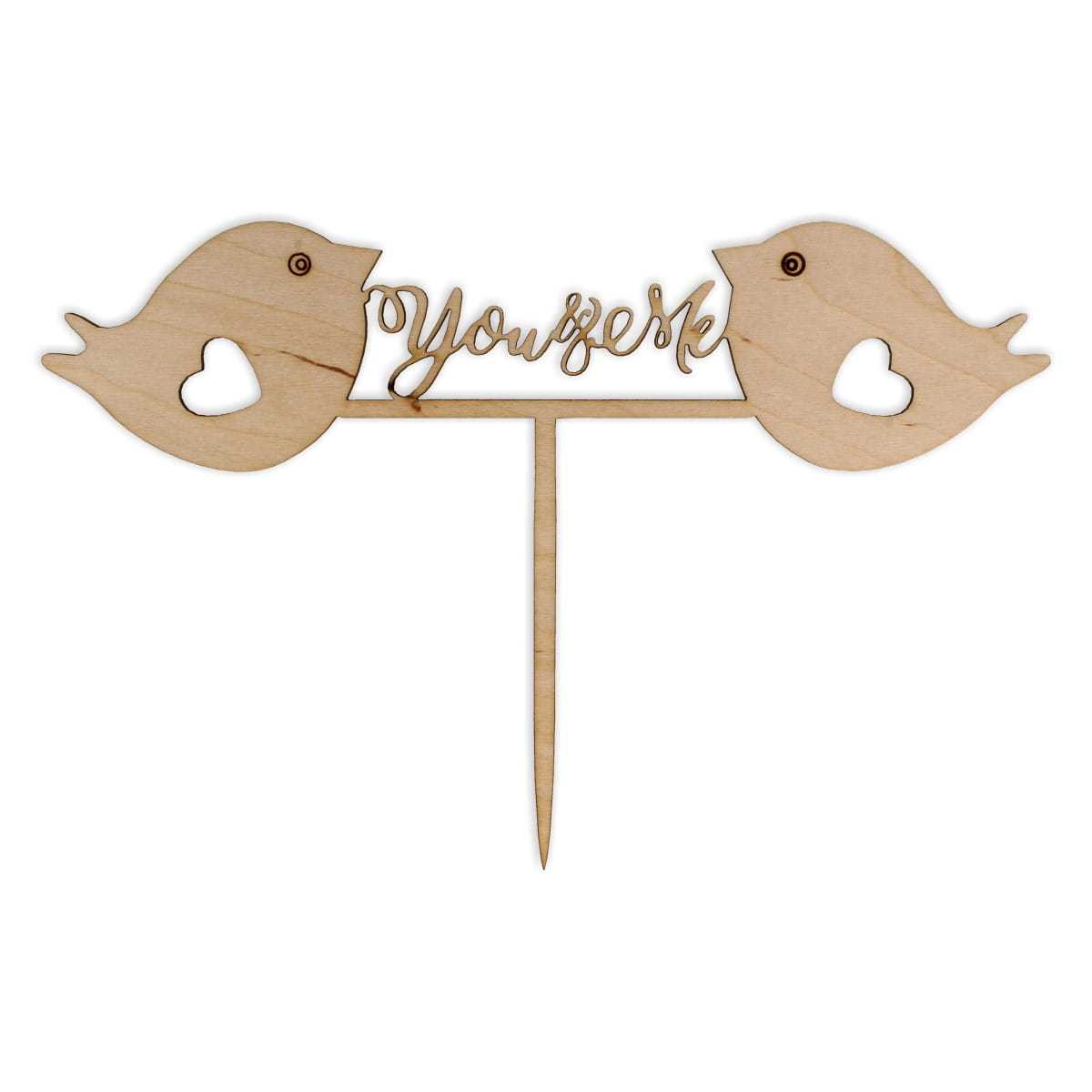 Ślubny (i nie tylko) topper przedstawiający dwa zakochane ptaszki połączone napis You&Me.